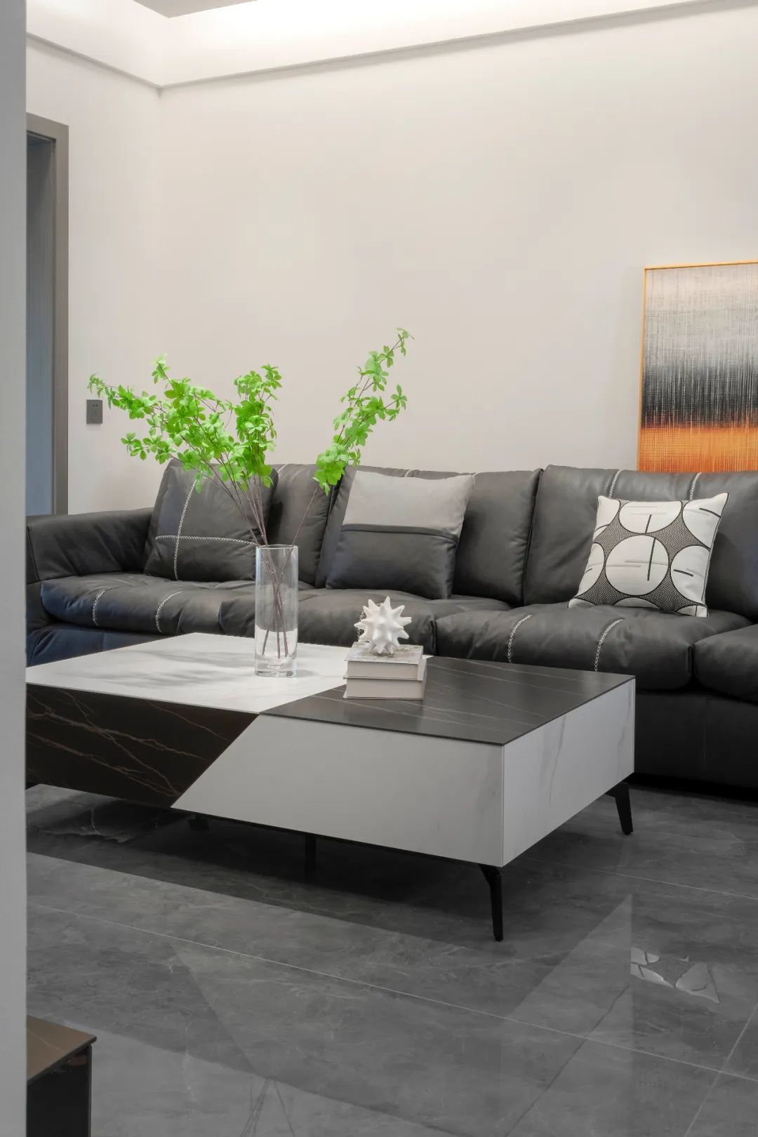 陽臺和客廳打通,成為客廳的延伸,落地窗引入大量自然光,聯絡室內外,可以觀景休閑將心境從繁雜的世俗中短暫抽離。